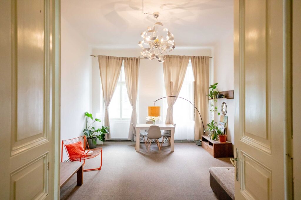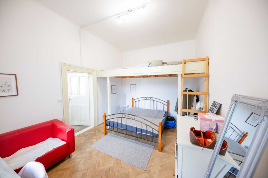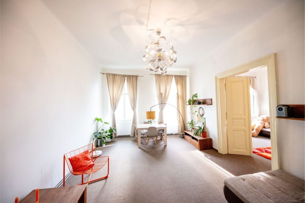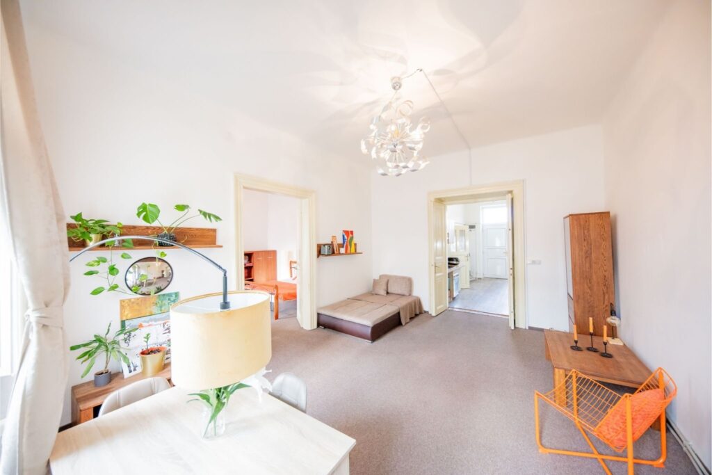 K prodeji nabízíme prostorný byt o dispozici 3+1 s vysokými stropy na skvělém místě a to jen pár kroků od Karlínského náměstí. Bytová jednotka je umístěna v 3. patře družstevního činžovního domu s výtahem. Vstup do bytu je z pavlače na dvorní, která je společná jen pro dva byty a část z ní je možné využívat jako balkón.