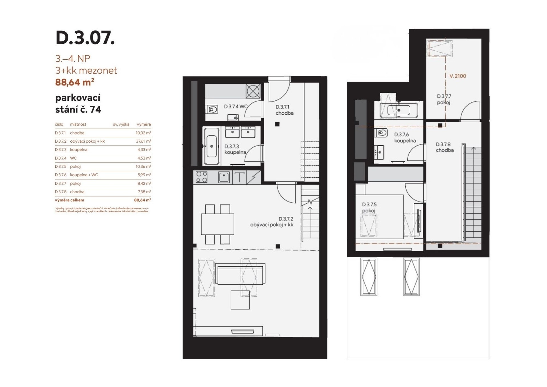 Byt o rozloze 88 m² spojuje kvalitní provedení s funkčností a nabízí tak skvělou možnost jak pro vlastní užívání, tak k investici. Interiér dispozičně zahrnuje vstupní chodbu, obývací pokoj s přípravou pro kuchyňskou linku, dvě ložnice, dvě koupelny s vanou a samostatnou toaletu. Jednotka je vybavena ve vyšším standardu sanitou Laufen, kvalitními bateriemi značky Grohe a podlaha z masivního dřeva. Vstupní dveře splňují bezpečnostní třídu 3 pro maximální bezpečnost. Součástí bytu je také příprava na instalaci předokenních žaluzií. Fotografie jsou pouze ilustrativní.