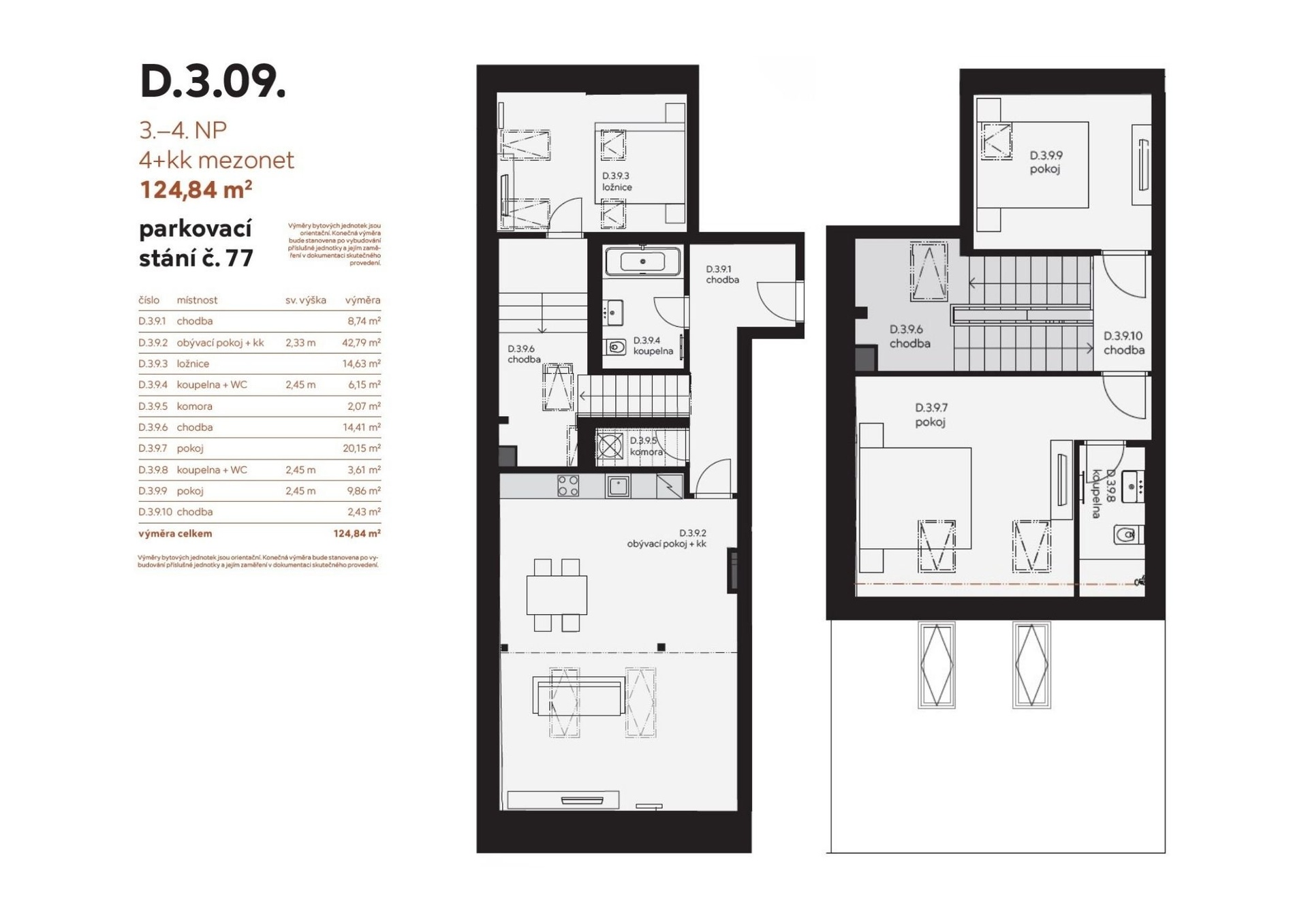 Byt o rozloze 124 m² spojuje kvalitní provedení s funkčností a nabízí tak skvělou možnost jak pro vlastní užívání, tak k investici. Interiér zahrnuje vstupní chodbu, obývací pokoj s přípravou pro kuchyňskou linku, tři ložnice, dvě koupelny z toho jednu s vanou a druhou se sprchovým koutem a komoru. Jednotka je vybavena ve vyšším standardu sanitou Laufen, kvalitními bateriemi značky Grohe a podlaha z masivního dřeva. Vstupní dveře splňují bezpečnostní třídu 3 pro maximální bezpečnost. Součástí bytu je také příprava na instalaci předokenních žaluzií. Fotografie jsou pouze ilustrativní.