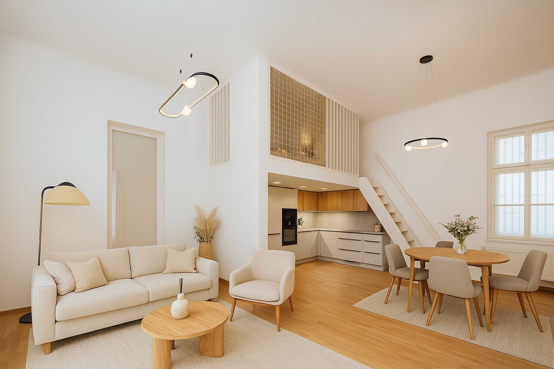 Jednotka o velikosti 72 m² nabízí vstupní halu, obývací pokoj propojený s plně vybaveným kuchyňským koutem, ložnici, prakticky řešené spací patro a koupelnu se sprchou a toaletou. Byt je situován do klidného dvora, díky čemuž poskytuje prostor pro nerušené bydlení i ideální podmínky pro investiční pronájem.