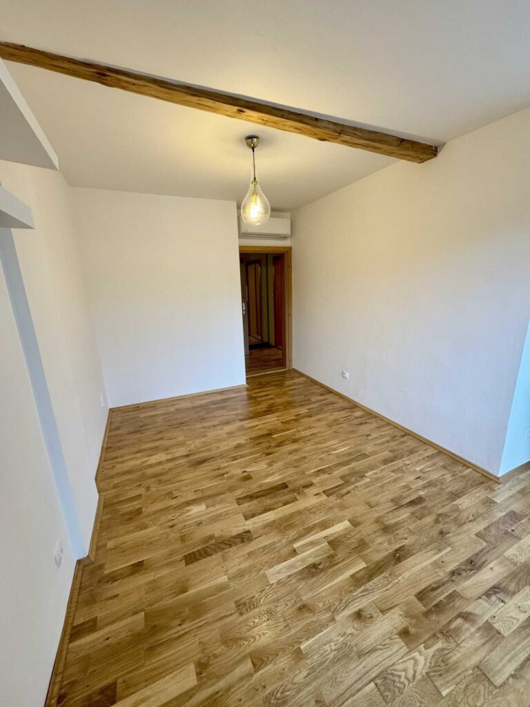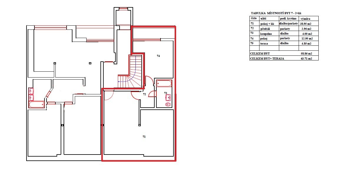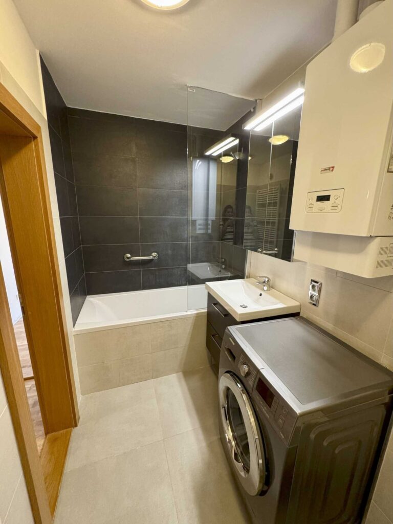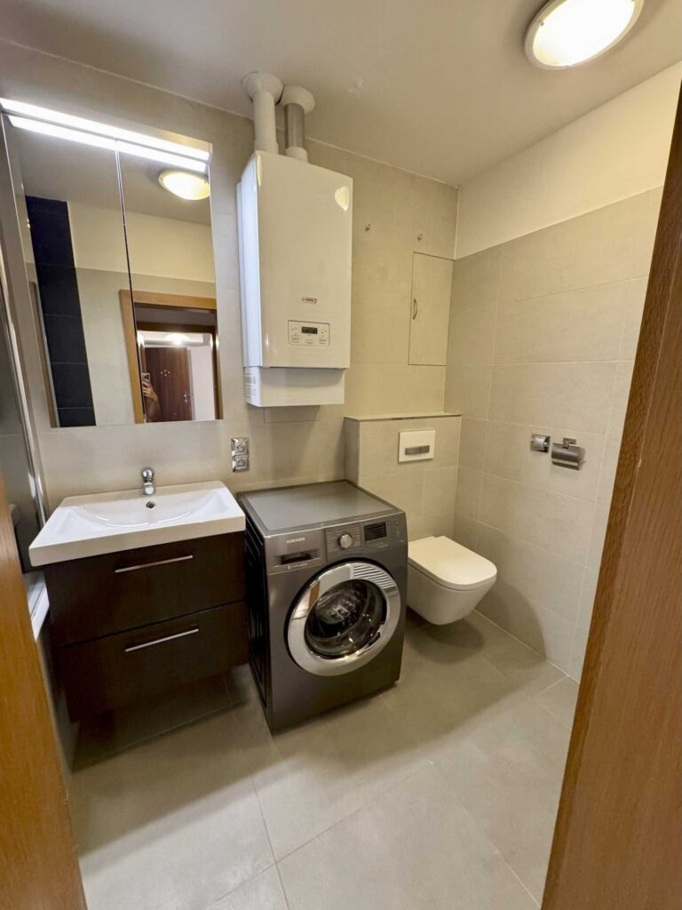 Tento nezařízený byt o velikosti 59 m² se skládá ze vstupní haly s vestavěnou skříní, prostorného obývacího pokoje s plně vybaveným kuchyňským koutem (sporák, trouba, digestoř, lednice s mrazákem, mikrovlnná trouba, myčka nádobí), ložnice a koupelny s vanou a toaletou. K bytu náleží také terasa a klimatizace.
